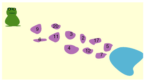 Trên mỗi viên đá có đánh các chữ số. Có một chú ếch muốn nhảy qua các viên đá này để sang được bờ bên kia. Chú ếch này có thể nhảy cách qua một viên đá hoặc nhảy liền đến những viên đá kế tiếp. Và tích của tất cả những viên đá mà chú ếch nhảy qua sẽ là 19635. Vậy các bạn hãy tìm xem chú ếch đã nhảy qua những viên đá nào nhé.