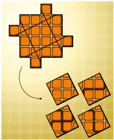 Các bạn hãy sử dụng 4 đường cắt sao cho chia hình này thành 9 phần, sau đó ghép những phần này lại với nhau để được 4 hình vuông giống nhau hoàn chỉnh.
